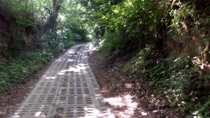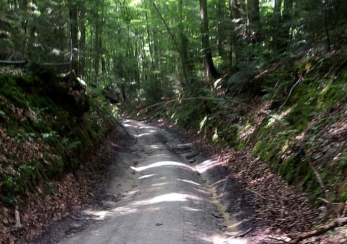 Jeden wyprzedzony na podjeździe zawodnik, drugi prawdopodobnie w Krasnobród. Na podłożu nie mogę doliczyć się więcej niż 6 śladów opon. Kolejne z trudem pokonywane podjazdy, kolejne zjazdy. Krótki moment oddechu w dolinie rzeki Wieprz. Miejscowość Bondyrz i, jak się wkrótce okaże, najtrudniejszy i miejscami najbardziej stromy podjazd pod górę Dach. Licząc od poziomu rzeki będzie to nieco ponad 120 metrów przewyższeń. Niby niewiele jeżeli jedzie się asfaltową drogą ale tu o asfalcie mógłbym jedynie pomarzyć. Pierwszy z ponurych wąwozów lessowy, których uroki będzie mi dane dokładnie zgłębić na dalszej części trasy. Mokry szuter, a w najbardziej stromym miejscu betonowe płyty. No nie przesadzajmy, przecież nikt mnie tu nie widzi. Zsiadam z roweru i kilkadziesiąt kluczowych metrów idę prowadząc (tzn. pchając) rower pod górę.