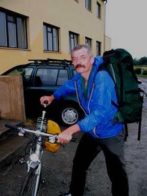 Niemal do ostatniej chwili przed startem waham się, co mam na siebie założyć. Wczoraj od rana było tu pogodnie, jednak już późnym popołudniem drogę od stacji PKP pokonywałem w strugach deszczu. Ranek znów jest pogodny, ale dalsza prognoza nie jest optymistyczna. Wreszcie decyduję się, zakładam tradycyjnie już "kolarską" flanelkę na górę, oraz krótkie spodenki na dół. Pomimo tego że może być chłodno, "kolarskie" jeansy nie wydają się odpowiednim ubraniem - szczególnie, gdy zacznie padać deszcz. Żeby chociaż z jednej strony nie było mi zimno pod flanelową koszulę wkładam bluzkę z krótkim rękawkiem a do sakwy wrzucam kurtkę p-deszcz. i na wszelki wypadek polar.