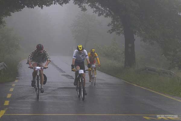 Zjeżdżam. Gęsta mgła i las powodują, że robi się ciemno, tajemniczo, bajkowo, trochę jak niektórych filmach Hitchcock'a. Mgła ogranicza widoczność. Jadę maksymalnie skoncentrowany. Przede mną, jak za dotknięciem czarodziejskiej różdżki, wyłaniają się kolejne krótkie odcinki asfaltu. Podobnie, jak na innych zjazdach, mknę z szybkością dochodzącą do 55 km/godz. zwalniając tylko na nie dających się pokonać z pełną prędkością "agrafkach" i na widok nadjeżdżającego z dołu samochodu. Szusuję przez rozciągniętą na kilka kilometrów Nową Bystrzycę i Bystrzycę Kłodzką. Tu rozjazd dla tych, którzy jadą na krótki i długi dystans. Nawet przez chwilę nie waham się - nie czuję jeszcze zmęczenia, które kazałoby, chociaż przez chwilę, zastanowić nad sensem pokonywania kolejnych przełęczy i kolejnych 100 trudnych kilometrów.