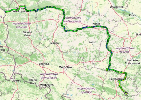 Czujny przejazd przez miasto Zawiercie, później Myszków. Mijam miejsca znane z poprzedniej edycji. Objeżdżam Jezioro Porajskie - duży zbiornik wodny na początkowym etapie trasy. Przejeżdżam opłotkami Częstochowy. Tu zmiany trasy są raczej kosmetyczne. Jadę wąską ścieżką w bezpośredniej odległości od nurtu, szybko przybierającej w wody Warty.
