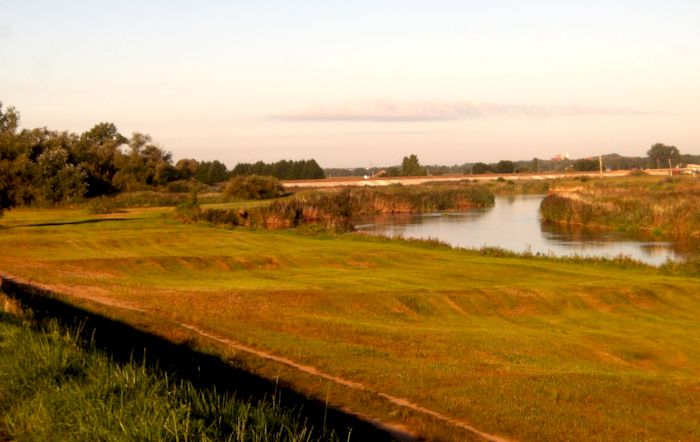 Ponownie przecinam przejeżdżając pod estakadą autostradę A2. Na prostej drodze wzdłuż Warty pojawia się przeszkoda, czyli otoczony wałami dopływ o nazwie Czarna Struga. Kiepską gruntową drogą (gorszą niż ta nadwarciańska) jadę do najbliższego mostku na Strudze. Jeszcze gorzej wygląda obrośnięta trawą, mocno nierówna droga powrotna. Chwila wytchnienia na ruchliwej drodze do mostu w miejscowości Ląd. Kiedy nie było jeszcze autostrady jechały tędy sznureczki TIRów. Mijam parking, na którym chwilę wypoczywałem przed trzema laty i wjeżdżam na najtrudniejszy wówczas piaszczysty odcinek Nadwarciańskiego Parku Krajobrazowego.