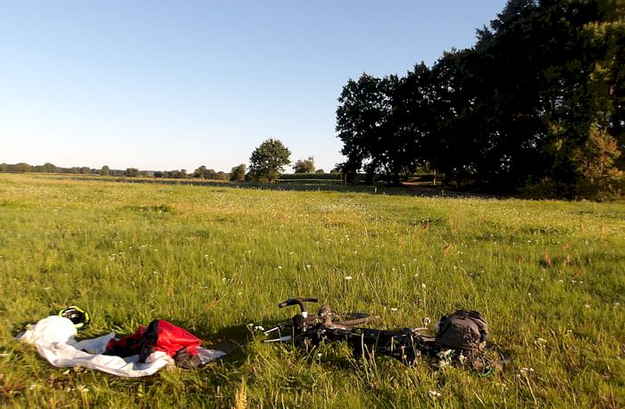 Nie przyjechałem tutaj by się ścigać, a na pewno nie ścigać za wszelką cenę. Nadszedł czas na zasłużony odpoczynek. Pojedyncze ukryte za drzewami zabudowania (później zidentyfikuję, że to wioska Białobrzegi) nie wydaje się najlepszym miejscem, by rozłożyć śpiwór. Rano mógłbym się mocno zdziwić gdybym zobaczył miejsce, w którym spędziłem noc. Wreszcie wyjeżdżam na bardziej odludne przestrzenie. Nie zamierzam wybrzydzać. Kilkaset metrów dalej rozkładam się na niewysokim wale na skraju z jednej strony nadwarciańskich łąk, z drugiej wiejskich pół. Jestem porządnie zmęczony, więc tylko przez chwilę rejestruję bzyczenie jakiegoś komara i szybko zapadam w głęboki sen.