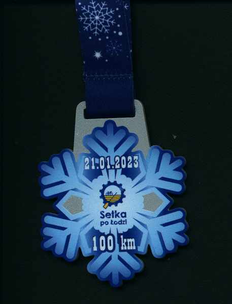 Jako ukończyciel zawodów na mecie otrzymuję jedyny w swoim rodzaju śnieżny medal. Medal który doskonale wpisuje się w warunki jakie panowały na trasie - jedyny taki śnieżny dzień w ciągu całego "zimowego" miesiąca. Czy medal byłby tak samo smakowity podczas wiosennej pogody jaka panowała na początku stycznia? Zgodnie z przewidywaniami niemal połowa zawodników albo wycofała się albo nie zmieści w wydłużonym do 12 godzin (na 100 km) limicie czasu.