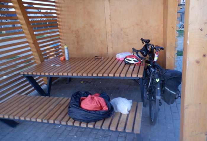 Lepszego miejsca dzisiaj nie znajdę. Kolacja. Mocowanie roweru przy pomocy targanego nie wiadomo po co ciężkiego U-locka. Ten sposób zabezpieczenia nowego roweru zapewni mi komfort podczas snu. Kolacja. Rozkładanie śpiwora, polarowa bluza podłożona pod biodra zastąpi materac. Buty przykryte ciuchami to będzie moja poduszka. Budzika nie muszę nastawiać. We właściwym czasie obudzę się sam.