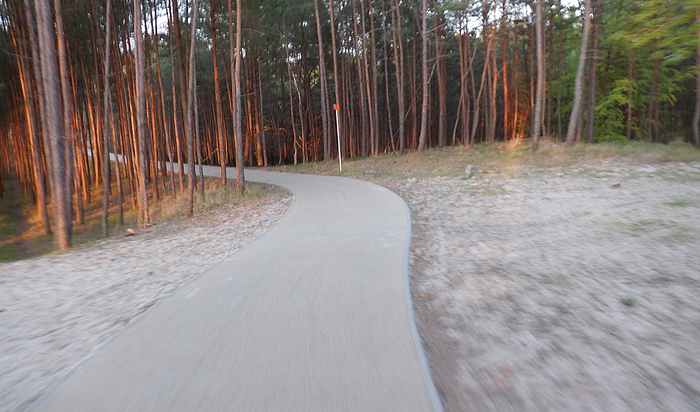 Mijam Międzyzdroje i zapuszczam się na obszar Wolińskiego Parku Narodowego. Tu czeka mnie jedyny w tej części trasy podjazd. Nie ma szału, nogi wypoczęte, nachylenie niewielkie. Po chwili wznoszę się na nieosiągalną w najbliższym czasie wysokość 70 m. n.p.m. Przez wiele kolejnych godzin i kilkaset kilometrów będzie do znudzenia płasko, a wysokościomierz rzadko przekroczy jednocyfrową wartość.