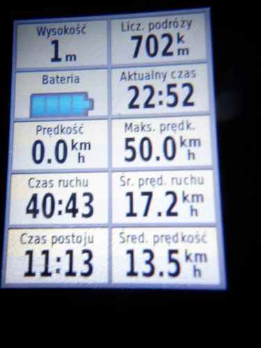 godz.11:30 - 228,7 km, czas jazdy 11h 30min., czas postojów 30min., średnia 19,9 km/godz.