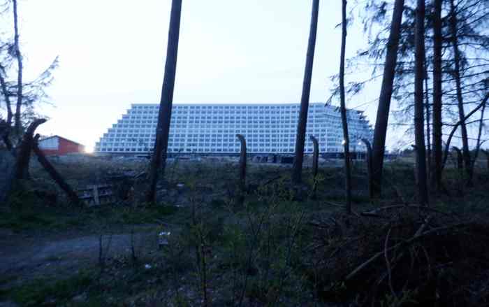 Mijam jakieś nadmorskie wioski. Przez chwilę zatrzymuję się, by po raz pierwszy spojrzeć na widoczne poniżej morze. Mijam rezerwat przyrody chroniący nadmorski klif w Łukęcinie. Wkrótce drogę przez las przegradza metalowa siatka. Nie ma prowadzącej dalej drogi, zniknął rosnący tu jeszcze nie tak dawno las. W oddali widać gigantyczny koszmarek architektoniczny - Hotel Gołębiewski w budowie. Robię fotkę kolosa tuż przed zapadnięciem ciemności. Jeszcze niedawno współczułem znajdującym się w trudnej sytuacji hotelarzom. Teraz nie byłbym zmartwiony gdyby pan G. splajtował, a budowla nie została ukończona. Jadąc przez kolejne wioski zobaczę "bardziej kameralne" wieżowce budowane nad brzegiem morza. Chyba jestem mało tolerancyjny w stosunku do lubiących wypoczywać inaczej.