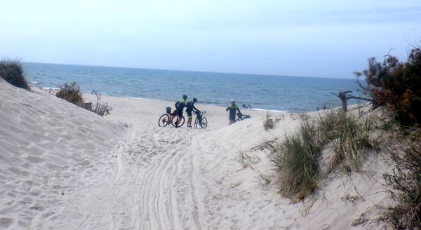 Relacja Jarka potwierdza się. Przeciwny boczny wiatr przy jeździe wybrzeżem zatoki nie robi na mnie większego wrażenia. Dopiero po zjeździe w las zaczyna się zabawa. W tym roku plaża stała się miejscem budowy (falochrony). Ciężki sprzęt rozniósł piach nawet na kilkadziesiąt metrów drogi, którą mamy przejechać. Nie ma siły by te przeszkody pokonali nawet ci z bikerów, którzy z powodzeniem przejechali po plaży. Pokonanie półwyspu zajmuje ponad 5 godzin.