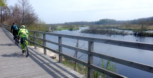 Drewniane platformy mające ułatwić jazdę, nie zawsze znajdują się w odpowiednim miejscu i nie zawsze spełniają swoje zadanie. Dodatkowo kończą się stromym "wbijającym" w ziemię zjazdem. Niektóre z nich bezpiecznie omijam jadąc obok. Ubiegłoroczny i tegoroczny przejazd przez bagna to jak dzień do nocy.