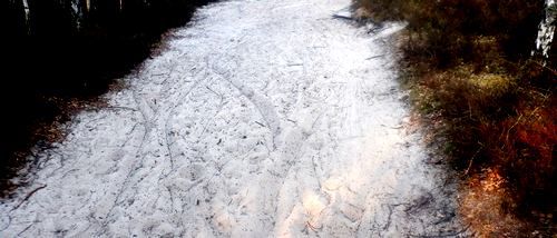 [... Nawet przy dobrym oświetleniu trudno wybrać optymalny wariant przejazdu (najtwardsze podłoże). Niewielkie piaski pokonywane w dzień bez problemu, nocą zaczynają stawiać opór. Niewielkie zboczenie z wyjeżdżonych kolein sprawia, że rower zaczyna "tańczyć" na piasku. Prędkość spada a czasami mimo wysiłku rower zatrzymuje się w poprzek drogi ...]