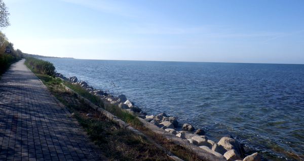 Jadę wzdłuż Zatoki na południe. Tą część trasy doskonale pamiętam, ponieważ przez pomyłkę pokonywałem ją poprzednio dwukrotnie. Wkrótce po stromym podjeździe rozpocznie się wypasiona, poprowadzona po nasypie dawnej linii kolejowej, ścieżka rowerowa. Mijam wiatę, pod którą wypadł mi nocleg podczas pierwszego przejazdu BBC. Ścieżka łagodnie wznosi się. Prowadzi prosto pod silny, upierdliwy wiatr. To najtrudniejszy dla mnie asfaltowy fragment na trasie. Zmagając się z podwójnym przeciwnikiem (podjazd, wiatr) przekonuję się jak silnym sprzymierzeńcem był wiatr na dotychczasowej trasie.