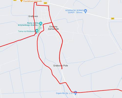 Przed nami długi prosty odcinek wzdłuż ucywilizowanej do postaci kanału rzeki Kłodawa. Zapamiętany bo pokonywałem go uprzednio przy silnym przeciwnym wietrze. Mijamy miejscowość w której drzemałem na ławce po zmaganiach z wiatrem. Czas szybko mija podczas rozmowy. Wszystko się zgadza z ubiegłoroczną trasą. Czy ktoś jeszcze spogląda na ekran GPS-a? Nieoczekiwanie ślad zniknął nam z ekranu, więc zawracamy dokładając gratis ponad 4 kilometry. W tym miejscu Bartek zmieniając trasę zabrał nam kolejne kilometry asfaltu. Strach pomyśleć co będzie podczas kolejnej edycji. Możliwości innych szykan jest przecież mnóstwo. Co sądzę o jeździe na pamięć już coś napisałem w innym miejscu.