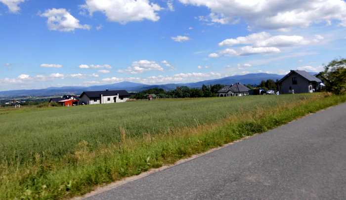 To jeszcze nie są Sułkowice. Przede mną wznosi się kolejny grzbiet. Na podjjeździe nie ma co liczyć nawet na kawałek asfaltu. Na przemian jadę i prowadzę rower drogą przez łąki i pola. Nieprzyjemny zjazd szybko się kończy. Rozrastające się miasto Sułkowice rozpycha się na okoliczne zbocza. Do wysoko położonych budynków prowadzi nowa asfaltowa droga.