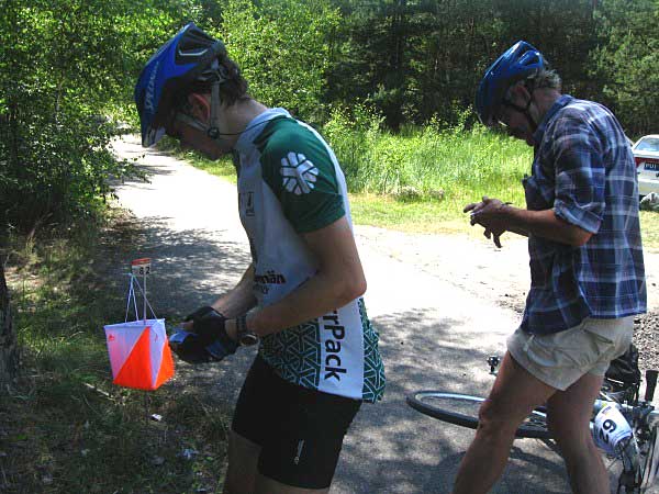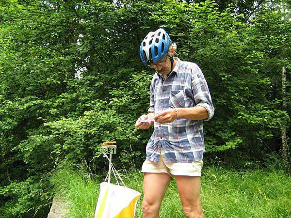 Rozdanie map, kilka minut na podjęcie decyzji o kolejności zaliczania punktów i jedziemy na start ostry. Policja konwojuje nas i asekuruje przy przekraczaniu ruchliwej szosy Warszawa-Katowice. Dalej już każdy będzie sobie radził samodzielnie. W decyzji o wyborze kierunku zaliczania punktów (na początek 5 czy 8 i 2) pomaga mi Piotr Buciak obok którego znajduję się kiedy dojeżdżamy na start ostry. Ruszam ze nim, jedziemy asfaltową drogą prosto na południe, czyli docelowo na PK8. Szalone tempo dochodzące do 40 km/godz. wytrzymuje 4 zawodników. Już z daleka widzę w lesie jakieś osoby i pomnik (mogiłę żołnierzy). Tu jestem jeszcze pierwszy. Po chwili zaczynają nadjeżdżać kolejne grupy bikerów.