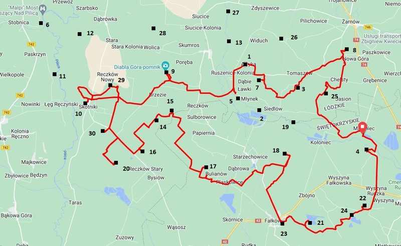 Pierwszym moim celem w części "pieszej" zawodów będzie zdobycie najwyższego punktu na trasie czyli Diablej Góry. Opuszczam las, w którym doszło do awarii i przede mną kilka kilometrów asfaltowej drogi. Chociaż asfalt ułatwia jazdę i wykorzystanie roweru jako hulajnogi, to jazda niemiłosiernie się dłuży. Kiedy nachodzi mnie zwątpienie przypominam sobie gościa, który (co prawda) na profesjonalnej hulajnodze pokonał 1400 km trasę maratonu Wschód). Kiedy wybierając skrót opuszczam asfaltową drogę zwątpienie w sens dalszej jazdy szybko mija. Wpycham rower ścieżką prowadzącą na szczyt wzniesienia. Punkt na Diablej Górze znajduje się obok pomnika czyli w tym samym miejscu jak podczas jednego z wcześniejszych Bikeorientów słynnego z tego, że brody na Pilicy trzeba było pokonywać wielokrotnie w różnych miejscach. PK9 - pomnik - 13:50.