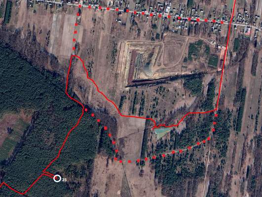 Jadąc w kierunku bazy mogę zaliczyć kolejny punkt. Poruszanie się na pieszo (hulajnogą) po asfaltowych drogach wzbudza dzisiaj moją niechęć. Rezygnuję z najbardziej naturalnej (gdybym jechał rowerem) drogi od północy. Postanawiam zaliczyć punkt od innej strony. Poruszając się pieszo mogę skorzystać z mniej przejezdnych dróg. Droga którą wybrałem wkrótce się kończy, a ja przedzieram się przez wysoką roślinność, przeskakuję przez rowy. Zatrzymuję się obok rozległego betonowego zbiornika. Moich obaw nie wzbudza fakt, że na zaktualizowanej mapie, Piotrek (organizator) nie zaznaczył tego obiektu. Nawet przez myśl nie przechodzi mi fakt, że zbiornik jest umieszczony na mapie, a ja znajduję się w zupełnie innym niż mi się wydaje miejscu. Droga którą jadę kończy się na łąkach. Bujna roślinność przez którą przedzieram się z rowerem sięga pasa. Z daleka widzę drogę którą powinienem wybrać już na początku. Kiedy już do niej docieram wystarczy pilnować śladów opon i jednocześnie kontrolować mapę by trafić prosto na punkt. PK25 - na górce - 17:26.