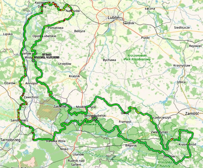 Nadwiślańskie miasteczko Kazimierz Dolny. To może oznaczać tylko jedno. Dalej wreszcie będzie spokojny przejazd wzdłuż rzeki. Uwierzyliście w zdanie, które przed chwilą napisałem? Odpoczynek w płaskiej nadwiślańskiej dolinie należy się ale widocznie jeszcze na odpoczynek nie zasłużyliśmy. Opuszczam miasto jadąc prosto na południe i wspinając się na znajdujące się z tej strony wzniesienie. W końcu skoro jest, to szkoda go nie wykorzystać. Szalony zjazd nad rzekę. Szok. Przez blisko 40 km poruszam się po zupełnie płaskim terenie, często asfaltowymi drogami. Łaskawość budowniczego trasy nie zna granic? Zna - to jedyny tak płaski odcinek na całym maratonie. Czyżby tu nie dało się wytyczyć bardziej interesującego przejazdu? A może to rozszerzająca się moda "asfaltowania" gravelowych tras [właśnie się dowiedziałem, że z innego ultra Warta800 wypadło kilka kultowych piaszczystych odcinków na rzecz asfaltu].