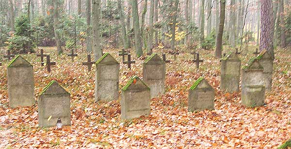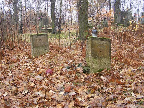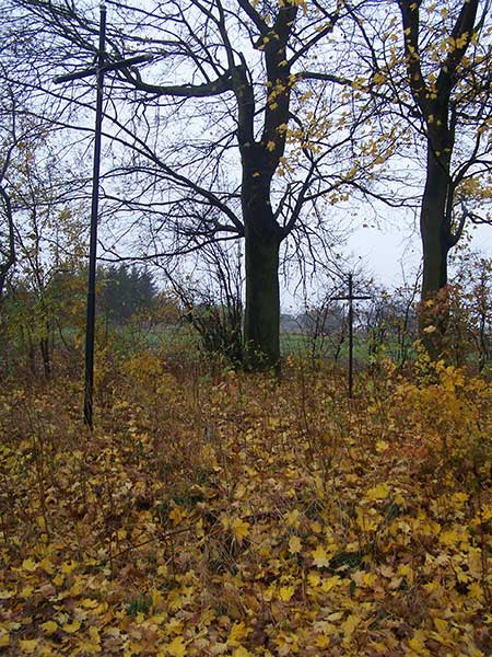 Przy leśnej drodze w środku lasu znajdują się 2 skromne, zadbane nagrobki. Jedyna pozostałość po cmentarzu wojennym. Jest wilgotno, ponuro, ciemno. Niezależnie czy jestem w lesie czy na otwartej przestrzeni dzisiaj mój aparat domaga się włączenia lampy błyskowej.
