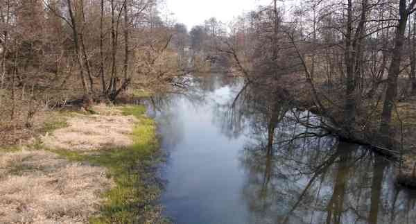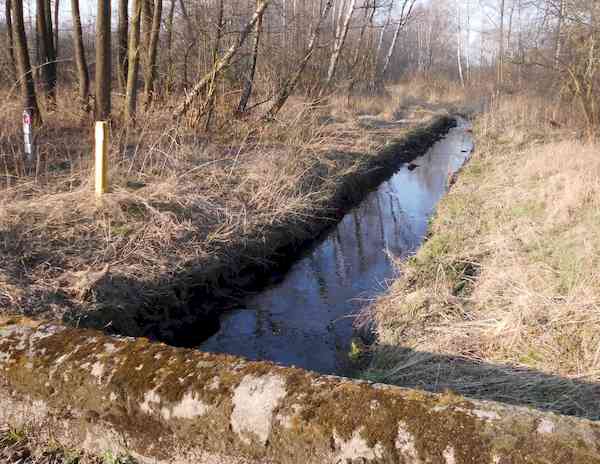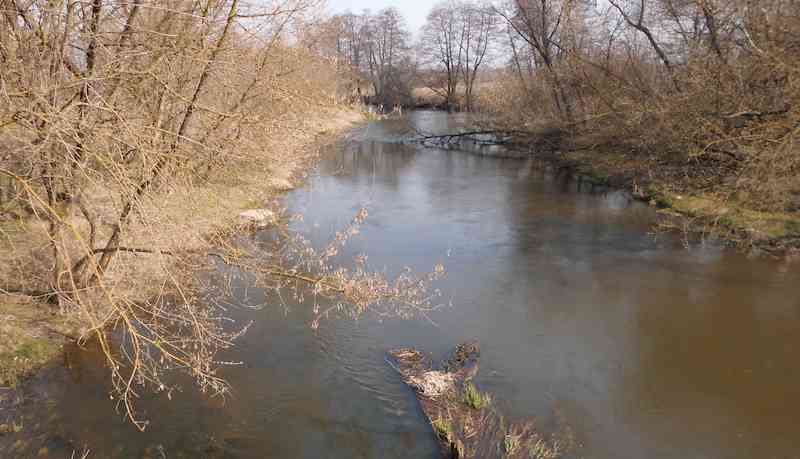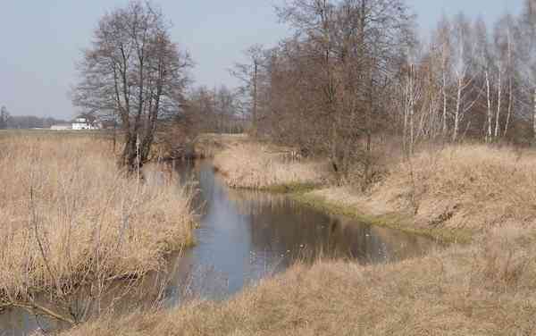 Tuż za miastem rzeka wpada do utworzonej w Plejstocenie pradoliny Warszawsko-Berlinskiej i skręca na wschód. Przez mijane wsie prowadzą dobre wyasfaltowane drogi. Z góry mogę jedynie popatrzeć na rozległe otaczające rzekę łąki. Szerokość pradoliny w tym miejscu to zaledwie nieco ponad 2 km (przy średniej szerokości 20 km). Próba jazdy bliżej rzeki wzdłuż łąk nie wydaje się możliwa do zrealizowania.