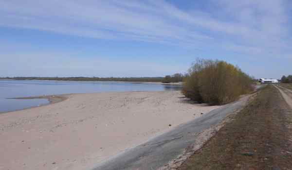 Po dalszych kilku kilometrach docieram do tamy spiętrzającej największy sztuczny zbiornik w województwie - Zalew Jeziorsko. Rezygnuję z wjazdu na doskonale mi znaną tamę i ruszam dalej. W okolicach Pęczniewa zjeżdżam na drogę poprowadzoną koroną wałów. Zbiornik Jeziorsko ukazuje się w pełnej okazałości. Zwykle o tej porze wypełniony po brzegi już teraz wykazuje znaczne braki. Tak na oko poziom jest obniżony o 1-2 m, odsłaniając piaszczyste łachy. W środku lata to tu zaledwie do połowy zalewu sięgało lustro wody.
