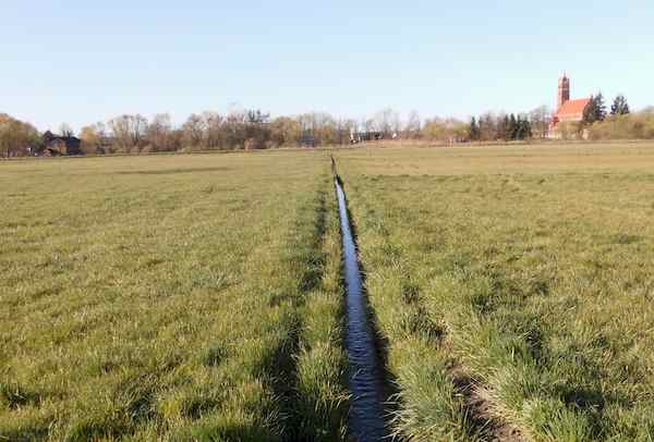 Robię niewielki zygzak by przejechać przez łąki przylegające do liczącej setki lat wsi Małyń. Z daleka można zobaczyć górujący nad okolicą neogotycki kosciół, a w tle jeden z najwyższych w kraju 346 metrowy maszt nadawczy w Zygrach. Trafiam na moment ich "podlewania" łąk. Widok bujnych, soczyście zielonych traw zdaje się zaprzeczać nadchodzącej, a widocznej poza nawadnianym obszarem suszy. System zastawek pozwala rotacyjnie kierować wodę na kolejne jeszcze nie nawodnione tereny.