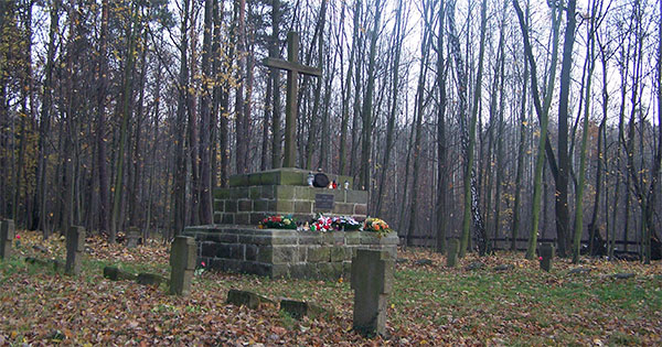 Po kilkunastokilometrowym dojeździe rozpoczynam właściwą wycieczkę. Las Wiączyński. Zamiast taplania się w błocie czekają na mnie twarde, nierówne koleiny. To innego rodzaju trudność, zamiast sily potrzebna będzie odrobina techniki. Mijam położony na skraju lasu cmentarz wojenny z okresu I wojny światowej. Liczne w okolicach Łodzi cmentarze odwiedzilem podczas innej wycieczki ==>. Mogiły i cmentarze z I wojny wiatowej