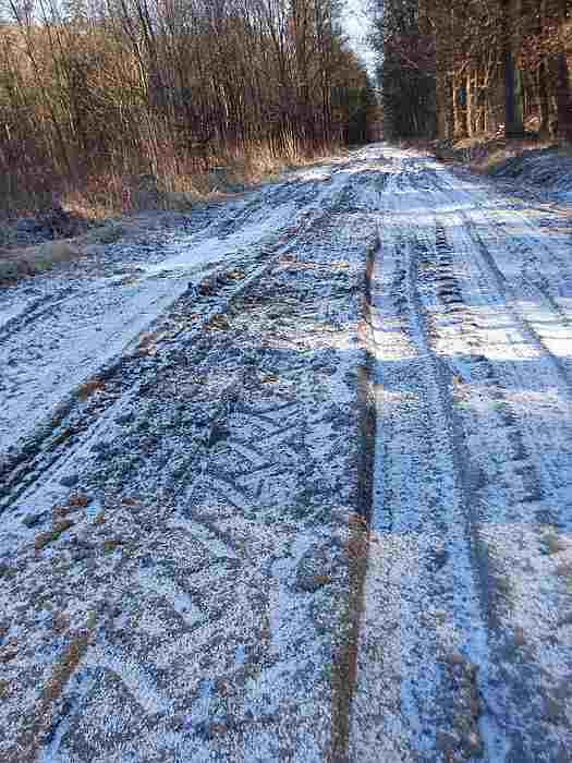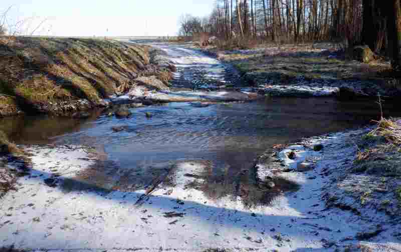 Jadę po nasączonej wodą dróżce. Z boku pokonuję niewielkie rozlewisko. Przed kolejnym nieco głębszym rowem poddaję się. Chociaż od celu dzieli mnie już naprawdę niewiele nie dalej może być jeszcze gorzej. Nie bez znaczennia jest kładka przez rzekę, która pozwoli przedostać się na suchy ląd.