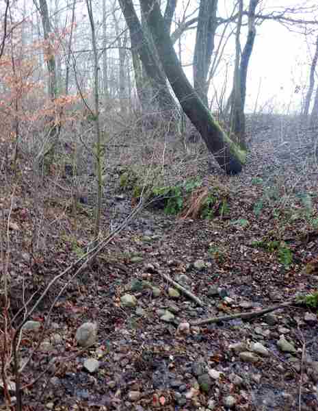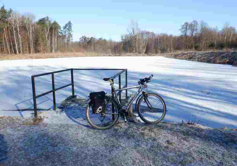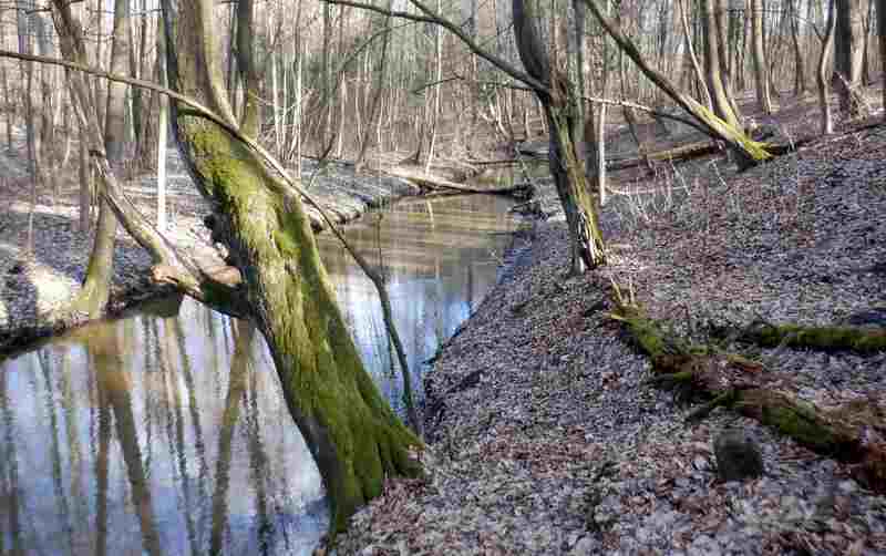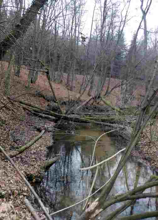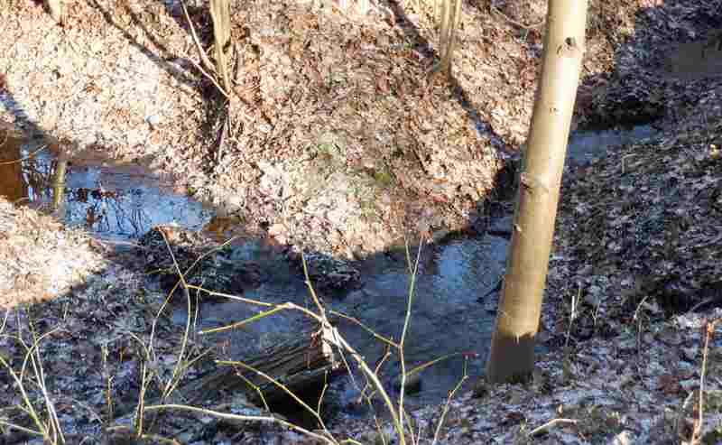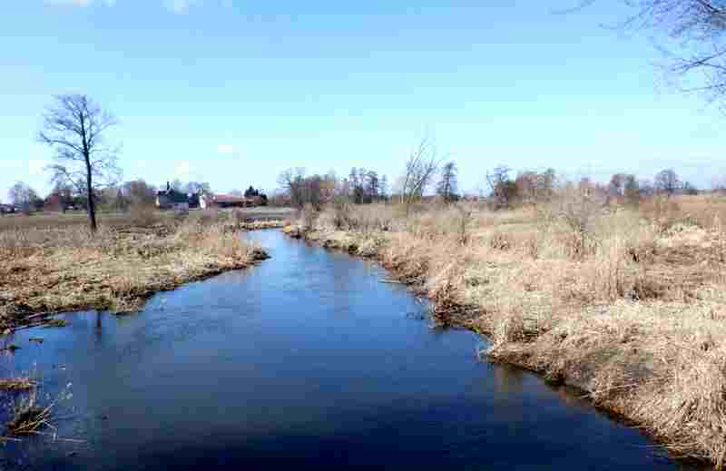 Ścieżka przez las wzdłuż szerokiego, podmokłego koryta rzeczki doprowadza mnie do licznych stawów hodowlanych. źródła rzeki nie budzą wątpliwości. Mijając ostatni ze stawów, jadąc lub prowadząc rower wzdłuż parowu dotarłbym do jego początku na skraju pól. W tym miejscu pojawiają się pierwsze wycieki wody, której ilość szybko się zwiększa. To miejsce odwiedziłem podczas rekonesansu na początku roku.
