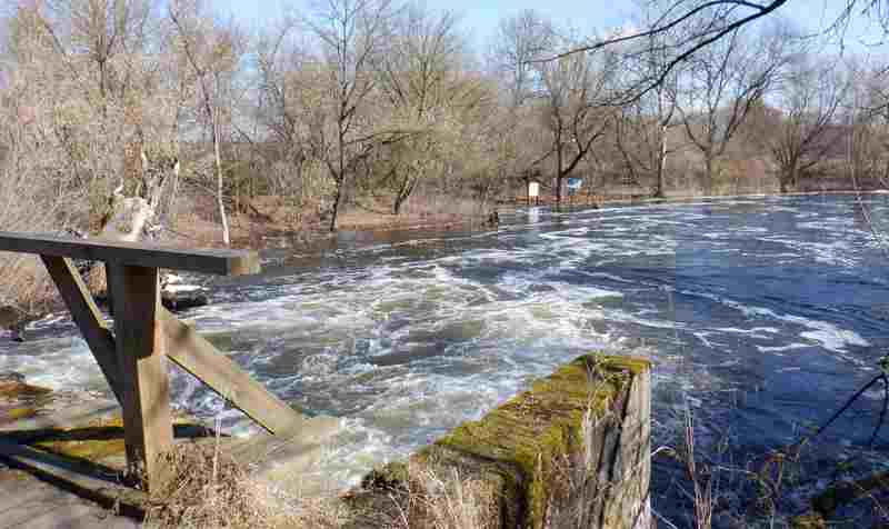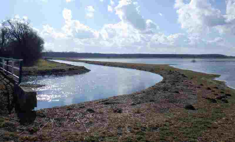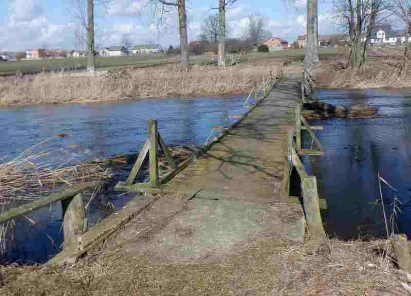 Na koniec skręcam na drogę prowadzącą przez łąki wzdłuż Mrogi aby dotrzeć aż do jej ujścia. Południowe słońce sprawiło, że częściowo rozmarzły już samochodowe koleiny. Jadąc jeszcze nie wiem czego mam się spodziewać na końcu drogi. Jestem kilkadziesiąt metrów od ujścia. Przede mną gęsty, być może podmokly las. Z boku tama w Sobocie z kładką dla pieszych. Kładka ratuje mnie przed powrotem rozmiękłą drogą.