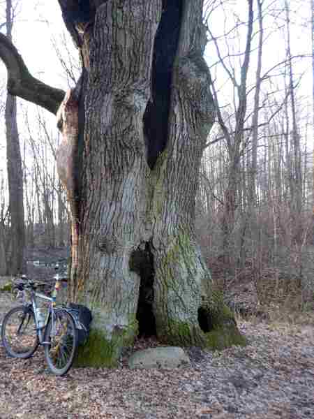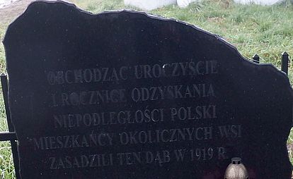 Wybieram drogi znajdujące się najbliżej rzeki. Odbijając ok. 2 km od rzeki na granicy wsi Karnków i Popów można zobaczyć 102 letni dzisiaj dąb. Drzewo zasadzone zostało w 1 rocznicę odzyskania niepodległości o czym zaświadcza granitowa tablica nagrobna.