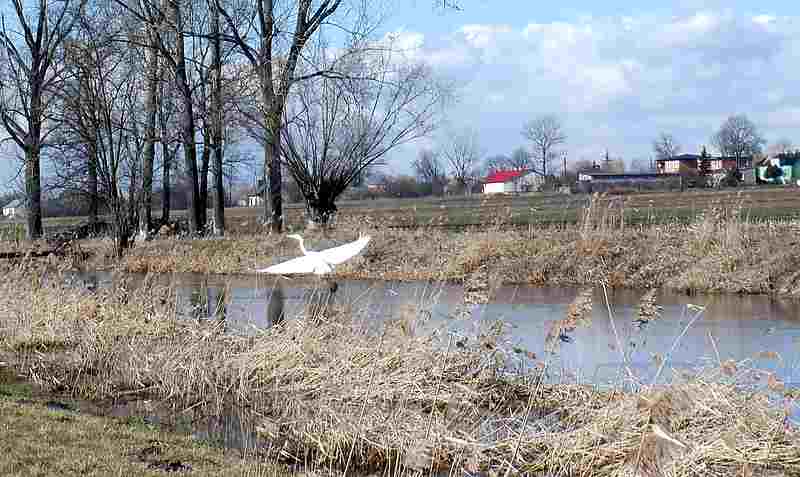 Skręcając w jedną z bocznych dróg przedostaję na drugą stronę rzeki. Jadąc wzdłuż Bzury powinienem dotrzeć aż do celu czyli uścia Moszczenicy. Z nadrzecznej trzciny "startuje" wielkie białe ptaszydło. Tym razem jestem przygotowany by uwiecznić wielokrotnie widzianą z oddali Czaplę białą, zimującą również w okolicach Łodzi.
