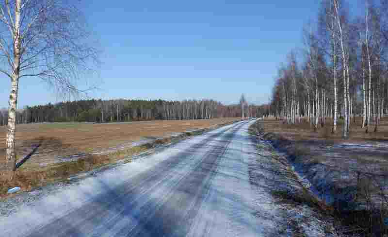 Przede mną długi droga pomiędzy polami prowadząca do wsi (od niedawna miasta) Piątek. Silny przeciwny wiatr mocno daje się we znaki. Wygląda na to, że odwrotny kierunek Piątek-Sobota byłby bardziej właściwy. W Piątku skręcam na południe i wiatr nie będzie już tak uciążliwy. Otoczona polami rzeka staje się niedostępna. Teraz będą ją spotykał jedynie sporadycznie. Mijam całe pola nakryte foliowymi tunelami - tu wyrosną nowalijki dla mieszczuchów.