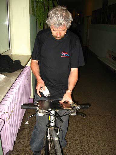 Przedstartowy wieczór to najlepszy czas, by doprowadzić swój rozpadający się sprzęt (niewątpliwie na skutek intensywnych przedstartowych treningów) do podstawowej użyteczności. Tomek walczy z obcierającym hamulcem tarczowym - jedna z koncepcji zakłada jego całkowity demontaż. Piotrek rozkręca i próbuje skręcić (początkowo bez odpowiednich kluczy) zbyt mocno dociśnięte konusy w tylnej piaście. Wydaje się, że w tym szaleństwie jest metoda - trening na zaciśniętych hamulcach, skręconych piastach i start w zawodach na wyregulowanym już sprzęcie. Wszystkich przebija Wojtek Burzyński, od kiedy pojawiam się w bazie, do późna w nocy uwalany w smarze walczy z łańcuchem, zmienia stary na nowy, później odwrotnie, coś skraca, coś dodaje, niszczy co najmniej jeden skuwacz. Efekt to kompilacja starego z nowym, łańcuch przeskakujący na kilku środkowych trybach.
