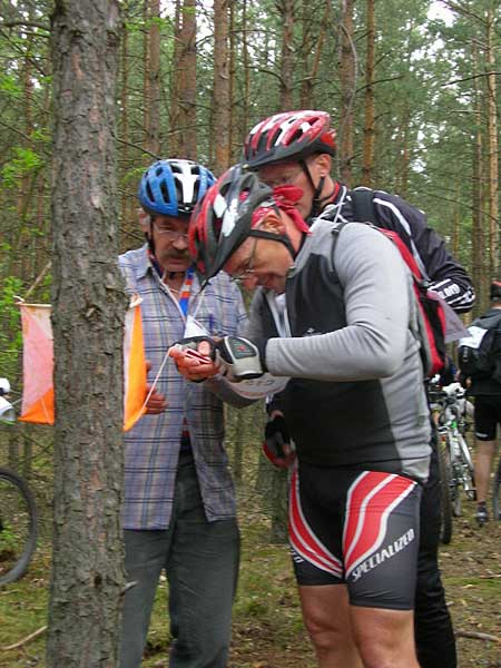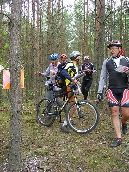 "Budzę się" i już raczej bez problemu zmierzam w kierunku najbliższego punktu K. Kiedy kontroluję mapę, dojazd nie nastręcza problemu. Zresztą w tym samym kierunku zmierzają jeszcze inni bikerzy. Skręt w odpowiednią przecinkę. Jazda niezbyt nadającą się do jazdy niewyraźną podmokłą leśną ścieżką. Drogę wskazują odciśnięte ślady tych, którzy byli tu przede mną. Niewidoczny na pierwszy rzut oka punkt K odnajdujemy, zgodnie z opisem, w narożniku polanki.