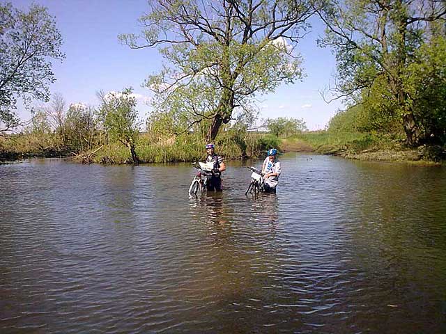 Pierwszy punkt, nie pozostawia w mojej pamięci żadnych wyraźnych wspomnień. Po krótkiej jeździe, chyba bezproblemowo, odszukujemy go na rogu polany. Dalej jedziemy leśnymi przecinkami w kierunku miejscowości Rafa. Po opuszczeniu lasu i konsultacji z letnikami lokalizujemy dokładnie swoje położenie jedziemy drogą między domkami, drogą przez łąki. Przed nami niewielki szeroko rozlany strumień. Okazuje się, że opis punktu - przejazd przez strumień - należy rozumieć bardzo jednoznacznie. PK2 znajduje się dokładnie po przeciwnej stronie rozlewiska a jedyna droga do niego prowadzi przez wodę. Zostawiamy rowery i zanurzamy nogi w przyjemnie chłodzącej wodzie. Po poprzedniej przeprawie woda sięgająca do kolan nie robi na nas żadnego wrażenia.