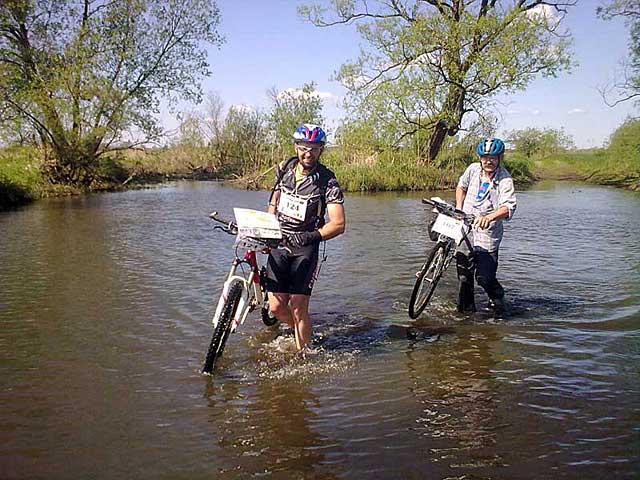 Widoczny z daleka przepust pokonują właśnie nasi koledzy. Rzucają tylko "punkt 50 metrów dalej" i odjeżdżają. Pozostawiamy rowery, biegiem pokonujemy odcinek do punktu - tam i z powrotem. Po chybotliwym drągu przeprawiamy się na drugi brzeg i ruszamy w pogoń za widoczną w oddali trójką bikerów. Wkrótce razem jedziemy w kierunku PK16.