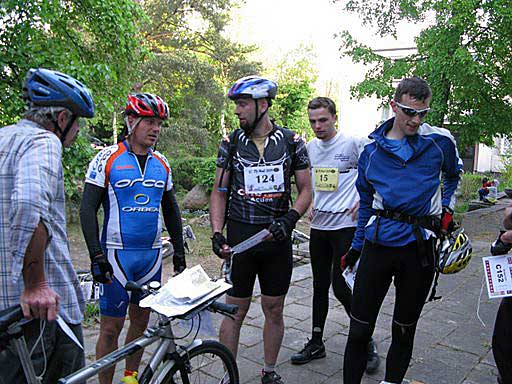W dość licznej grupie jedziemy w kierunku Odcinka Specjalnego wzdłuż rzeczki Dzięciołek. Tuż obok wyrysowanej na mapie trasy mamy odnaleźć 3 punkty kontrolne. Kręci się tu już bardzo duża ilość bikerów. Odnalezienie wszystkich punktów nie jest takie proste. Zaskakuje widok czołówki, która jeszcze nie opuściła tego miejsca. Paweł Brudło, Piotrek Buciak wracają po przejechaniu całego odcinka i odnalezieniu tylko 2 punktów.