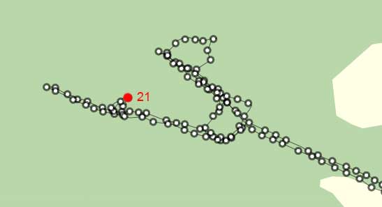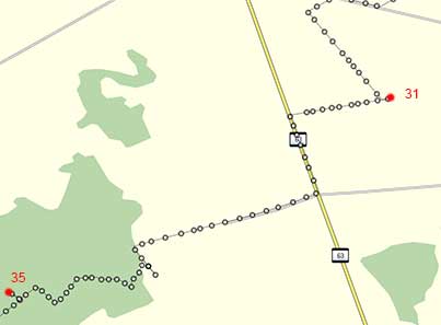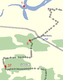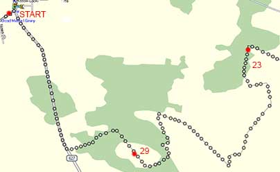 W pośpiechu "porządkuję", rozrzucone chaotycznie po mapie, czerwone kółka punktów kontrolnych określając kolejność zaliczania przynajmniej połowy z nich. Po sygnale startu jako pierwszy ruszam na trasę. Rozpocznę od wschodniej części mapy, a pierwszym celem będzie położony nieopodal asfaltowej drogi PK29. Precyzyjnie odmierzam odległości i skrupulatnie kontroluję mapę. W okolicach szczytu wzniesienia w głębi gęstego młodnika odnajduję ukryty lampion. PK29 - górka/ na dole zarośniętego wyrobiska (6:16 - 16 min. od startu).