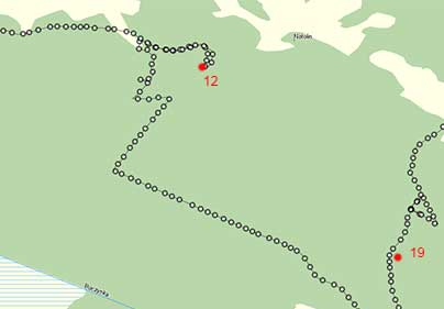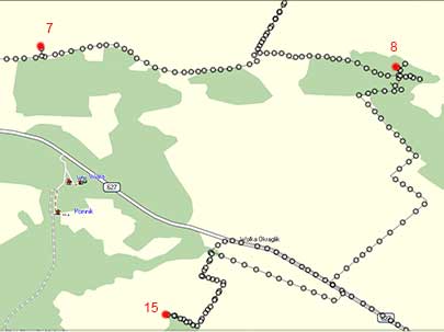 Zaliczenie kolejnego punktu wydaje się czystą formalnością. Opuszczam łąki i wjeżdżam w las. Chociaż odległość nie do końca się zgadza, a skrzyżowanie dróg nie do końca odpowiada temu co widzę na mapie, skręcam w jedną z przecinek. Nieco dalej w lesie powinien znajdować się punkt. Dobrze jest, są tu już napotkani wcześniej ekstremaliści. Niedobrze, bo od dłuższego czasu bezskutecznie przeszukują ten fragment lasu. Niby wszystko się zgadza tylko punktu nie ma. Nie mam pojęcia jak wybrnąć z tej sytuacji. Odpuszczam poszukiwania, może namierzę się od przeciwnej strony. Późniejsza analiza śladu wyjaśnia, że punktu szukaliśmy o ponad 500 m za wcześnie. Zmęczenie, dekoncentracja czy może rozprężenie po odnalezieniu trudnego punktu? (PK19 - zagłębienie w zboczu - ok. 11:02).