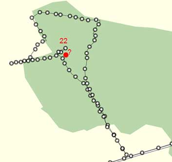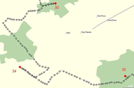 Grześ jedzie zaliczać jeszcze 2 kolejne punkty. Mnie udaje się namówić Tomka do zaliczania PK22 i powrót na metę. Przed nami przyjemny odcinek pokonywanej z wiatrem asfaltowej drogi. Zjeżdżamy w polną drogę, wjeżdżamy w las. Próbuję pilnować się lewej strony. Do czasu. Droga, którą jedziemy niezauważalnie dla nas skręca na północ. Ślady pozostawiono w błotnistym podłożu nie ułatwiają wykrycia błędu. Trafiamy na wycinkę. Pozostawiamy rowery by szybciej odnaleźć punkt. Bezskutecznie. Tu punktu na pewno nie znajdziemy. Opuszczamy las by określić swoje położenie. Skraj lasu nie zgadza się z tym co widzimy na mapie. Kilkaset metrów dalej odnajdujemy jedyny pewny punkt w zmieniającym się krajobrazie - rozwidlenie linii energetycznych. Powracamy do lasu by poszukać punktu w miejscu, w którym się powinien znajdować. W miejscu gdzie kiedyś była polanka teraz rosną krzaki, drzewa. (PK22 - granica kultur/niecka - ok.20:27).