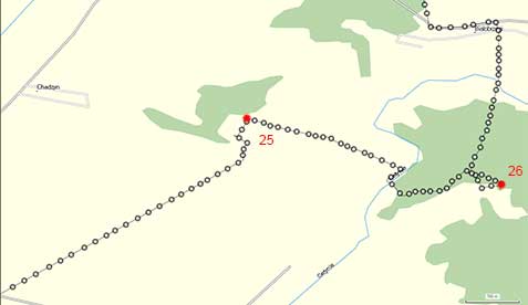 Opuszczamy punkt i jedziemy kiepską drogą przez pola. Uporczywy boczny wiatr nie ułatwia poruszania się. Jadę wolniej i pozostaję coraz bardziej z tyłu. Na asfalcie próbuję odrabiać stratę. Kiedy to się nie udaje, w końcówce wybieram skrót ledwie widoczną wśród bujnej trawy podmokłą dróżką. Mijam wąski pas lasu, jadę skrajem łąki. Przez moment zastanawiam się w którym miejscu jestem, gdzie jest punkt i dlaczego nigdzie nie ma Radka. Wreszcie mój wzrok pada pod nogi, na wąski ślad przez łąkę. Niewątpliwie nasi tu byli. Po chwili jazdy, na przeciwległym skraju łąki widzę z oddali lampion PK. Tuż za mną na punkt dociera mój rywal. PK25 - granica kultur/kępa drzew (9:12 - 23 min.).