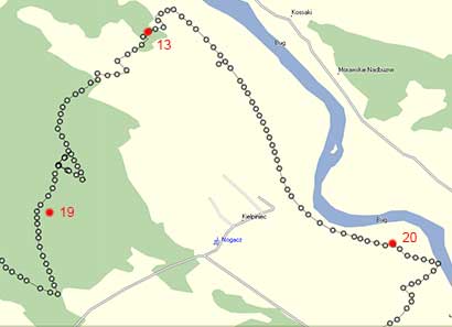 Przede mną niezalesiony teren i istniejące tu od zawsze polne drogi. Taki odcinek trasy rzadko może sprawiać problemy nawigacyjne. Przekraczam wał przeciwpowodziowy i docieram na brzeg Bugu. Gdzieś pomiędzy wałem p-pow a nurtem rzeki znajduje się niewielkie jeziorko. Jak tam dotrzeć nie wyjaśnia nawet mapka z rozświetleniem. Wbrew obawom jest łatwiej niż przypuszczałem. Piaszczysta droga doprowadza mnie prosto do celu. Brzeg zbiornika opuszcza Radek. Biegiem ruszam na poszukiwania. Bezskutecznie rozglądam się za powieszonym gdzieś na krzaku lampionem. Lekko zirytowany dostrzegam czerwień lampionu ukrytego w jakiejś dziurze. PK20 - brzeg jeziorka (9:59 - 27 min.).