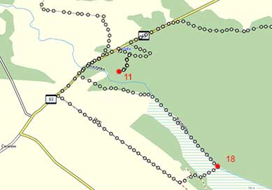 Bartek (zwycięzca zawodów) wybiera inny wariant zaliczania punktów. My pojedziemy na północ do PK24. Kiedy jedziemy zarośniętą trawą polną drogę słyszę huk i widzę jak z opony jadącego przede mną Pawła wystrzeliwuję biały pył. Defekt opony kończy naszą krótką, chociaż dobrze zapowiadającą się współpracę. Wkrótce skręcam w las i zauważam, że linia którą brałem za leśną drogą jest jedynie rowem. Z obu stron rowu pokazują się i znikają skręcające w bok lub zarastające krzakami dróżki. W tym samym kierunku zmierza Radek. Najlepiej byłoby przemieszczać się najbliżej rowu ale to nie zawsze jest wykonalne. Chyba zabrakło precyzyjnej kontroli odległości bo kręcimy się chaotycznie sprawdzając rów w różnych jego miejscach. Radek ma trochę więcej szczęścia, bo wcześniej namierza cel. Z oddali widzę jak rusza w dalszą trasę. PK24 - skrzyżowanie rowów/słupek oddziałowy (7:21 - 31 min.).