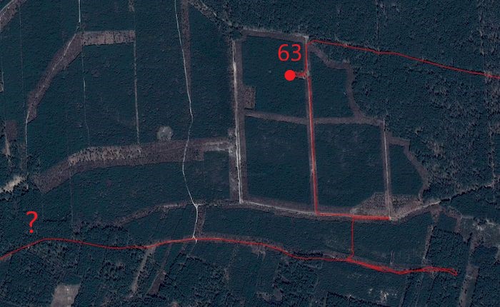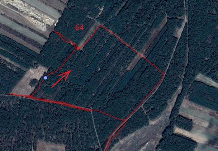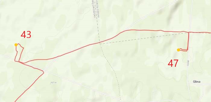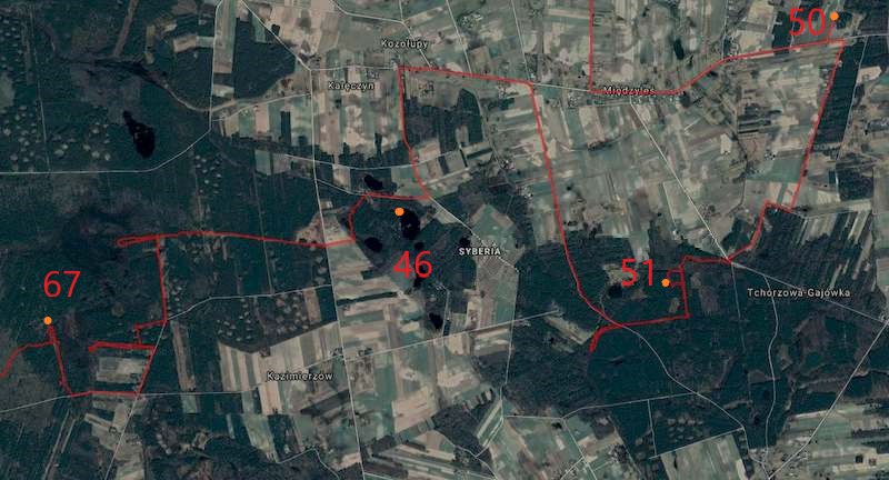 Po prawie oczywistym punkcie przychodzi to czego najbardziej nie lubię. Rozświetlenie okolic punktu kontrolnego w postaci zdjęcia satelitarnego czyli tzw. ortofotomapa. Droga w postaci cienkiej przerywanej linii na dawno nieaktualizowanej mapie też wzbudza niepokój. Pozostaje precyzyjne odmierzenie odległości, kontrola kierunku jazdy i mijanych skrzyżowań. Zatrzymuję się w miejscu wskazanym przez licznik. Jadę do przodu, cofam się. Patrzę na każdą zmianę kierunku drogi. Poszukuję jakichkolwiek szczegółów pozwalających potwierdzić moje miejsce na mapie. Na długim odcinku wzdłuż drogi którą tu przyjechałem, rośnie zwarty młodnik. Gdzie w takim razie znajdują się przecinki widoczne zarówno na mapie jak i rozświetleniu? Może nie dochodzą do pobocza drogi?