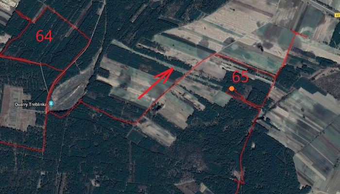 Mijam ukryte w lesie miejsce pamięci obozu Treblinka. Punkt znajdujący się powyżej tego miejsca na mapie nie wygląda zachęcająco. Znajduje się dokładnie pośrodku "niczego". Na rozświetleniu wygląda to niewiele lepiej. Zaznaczone dróżki nie istnieją. Są inne, których nie mam na załączonej mapce. Nie pozostaje nic innego jak wierzyć we wskazania linijki. Wybieram jedną z niewyraźnych przecinek. Prowadzę rower wydłuż niedawnej wycinki. Gdy się da - jadę. Jeżeli jestem na właściwej ścieżce, na jej końcu odnajdę lampion. Lampionu nie ma. Jest za to prostopadła droga nie zaznaczona na żadnej z map. Jadę na zachód na skraj lasu. Zniechęcony zawracam w przeciwnym kierunku. Przecież nie muszę zaliczyć wszystkich punktów. Mam szczęście. Trzeba budowniczemu przyznać, że jeżeli jesteśmy we właściwym miejscu, lampion nie jest ukryty i czasami widoczny nawet z dalszej odległości. Zaskakuje mnie widok czerwieni na drzewie obok drogi. Jest nieopodal miejsca, w którym po raz pierwszy tu wyjechałem. Nie sposób opisać uczucia satysfakcji ze znalezienia punktu, z którego poszukiwań już się zrezygnowało. Nie będę się upierał, że punkt znajdował się na końcu drogi. PK64 (2) - koniec drogi (3:59:39, 31,05, 50). Właśnie minęła godz.10.