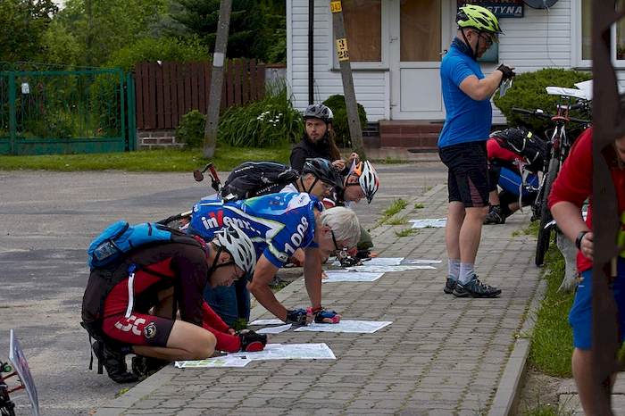 Żeby dostać się do kolejnego punktu najkrótszym wariantem musiałbym pokonać pas porośniętego bujną roślinnością i być może podmokłego lasu. Po kilku metrach wycofuję się. Trzeba znaleźć najbliższą drogę/przecinkę i objechać niemożliwy do pokonania teren. Z przeciwnej strony nadjeżdża Piotr Buciak. Jak się okaże na mecie zwycięzca zawodów, który znokautował swoim wynikiem pozostałych uczestników.