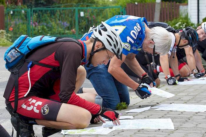 Wczesna pobudka, przygotowania, rozdanie map. To już chyba tradycja Dymna, że po odprawie otrzymujemy cały plik map (8 szt.) o różnej wielkości i o różnej skali . Tym razem jest to główna mapa 1:50:000 (w trzech częściach - 2xA3+1xA4), rozświetlenia punktów (3 arkusze A4 - zwykle w skali 1:25:000), zadanie specjalne (fotka satelitarna i mapka z rzeźbą terenu o nieokreślonej skali). Szczęśliwie (lubię je gubić) opisy punktów kontrolnych znajdują się na jednej z części głównej mapy. Zamiast karty startowej mam na przegubie urządzenie wielkości zegarka. Dla pewności przed zgubieniem dodatkowo zabezpieczam je zipem. Podobnie jak większość startujących przyjmuję pozycję orientalisty przygotowującego się do startu.