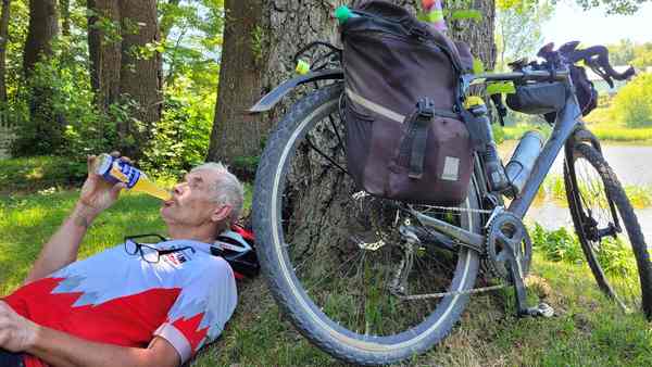 Żeby zająć jakiekolwiek miejsce w tej rywalizacji muszę najpierw dojechać do mety. Tym razem odpoczynek przedłuża się i trwa prawie pół godziny. Najlepszym wyjściem byłoby przeczekanie przeczekanie najgorętszych okołopołudniowych godzin właśnie w przewiewnym, zacienionym miejscu. Do przodu popycha mnie myśl, że jeżeli się pośpieszę to, być może, uda się dojechać do mety przed jutrzejszymi, jeszcze bardziej intensywnymi upałami, lub uda się ograniczyć jazdę w upale do minimum.