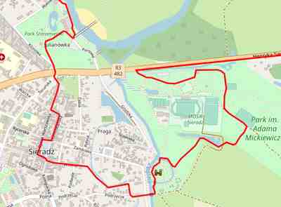 Nadchodzącym wyzwaniem jest sprawne pokonanie kolejnego odcinka specjalnego czyli kreślenie przedziwnej figury podczas przejazdu przez Sieradz. Kiedy mylę trasę słyszę nawoływania nadjeżdżających z tyłu zawodników. Uliczki miasta i ścieżki znajdujących się tuż obok terenów rekreacyjnych pokonam w doskonałym towarzystwie Sebka (nr 13). Radka (31) i Borysa (36). Dwóch pierwszych będę spotykał na trasie jeszcze wielokrotnie. Atrakcje Sieradza? W pamięci utkwił mi jedynie widok kolorowej kreski na ekranie GPS-a i tylnych kół kolegów jadących przodem.