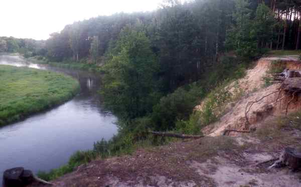 Moim zmartwieniem jest teraz piaszczysta leśna droga na przeciwległym brzegu Pilicy. Przy odrobinie staranności w wyborze miejsca przejazdu (bliższy lub dalszy skraj drogi) ten fragment trasy udaje się pokonać niemal bezboleśnie. Teraz ślad kieruje mnie ponownie nad rzekę. Warto było. Zatrzymuję się na skraju wysokiej skarpy z malowniczym widokiem na rzeczną dolinę. To miejsce jest dla mnie bardziej interesujące od budowli napotkanych podczas przejazdu przez rozgrzane w słońcu miejscowości.